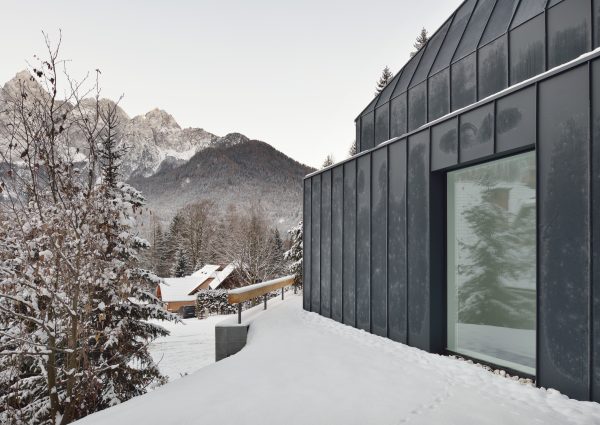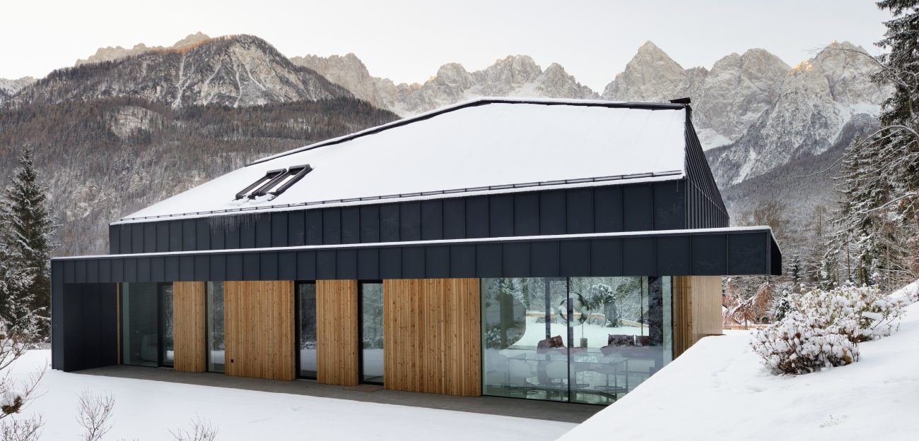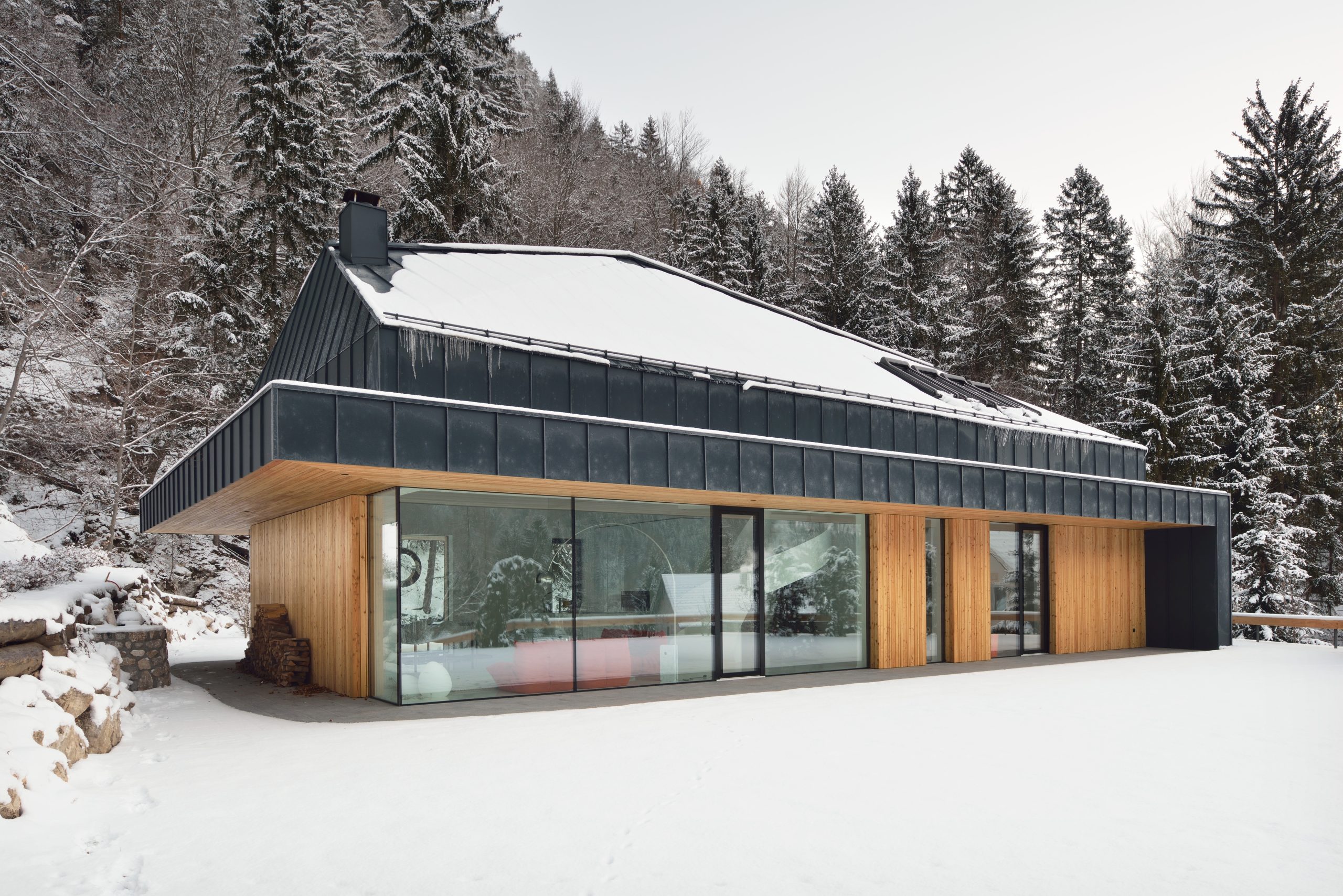 Una casa vacanze ai margini del bosco, dove i proprietari volevano che si sentisse il battito della natura circostante in tutte le stagioni. Questo è stato ottenuto con grandi superfici di vetro.