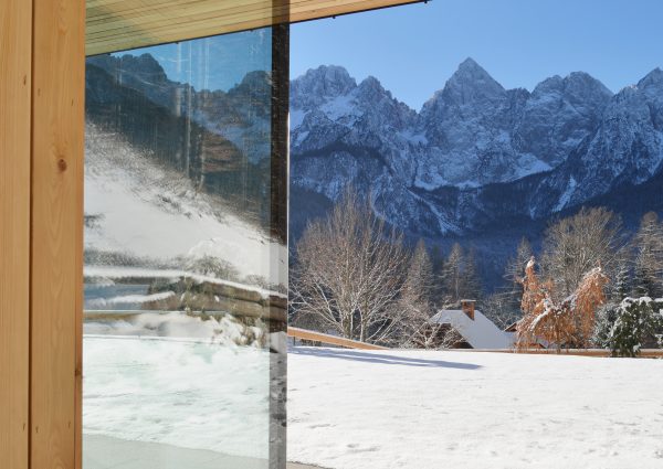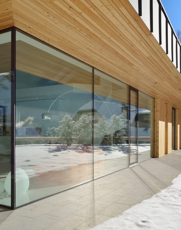 Finestra per architetture moderne con esterno in vetro: il legno è nascosto dietro il vetrocamera con bordo smaltato, donando alla facciata un aspetto minimale e pulito. All’interno rimane visibile il legno caldo e lavorato con precisione. Una soluzione che garantisce tenuta e stabilità anche nei grandi formati – un elemento architettonico discreto ma di forte identità.