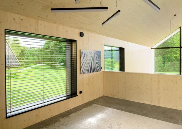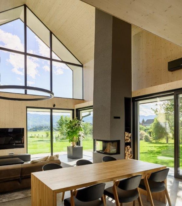 La casa unifamiliare C di Lesce combina tutti gli spazi privati in un’unica unità abitativa nella sua pianta semi-aperta. Il volume a due piani conferisce al design classico della casa un’atmosfera ariosa e aperta, con molta luce naturale in ogni momento della giornata. Gli spazi abitativi e di servizio sono ben collegati, dalla hall alla cucina con soggiorno, guardaroba e sauna. Il design della casa segue le abitudini e le routine degli occupanti. Al piano superiore si trovano le aree private – camere da letto e bagni. Il materiale di costruzione è il legno, visibile nella sua interezza all’interno dell’edificio. (Foto: Miran Kambič)