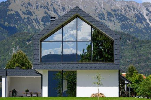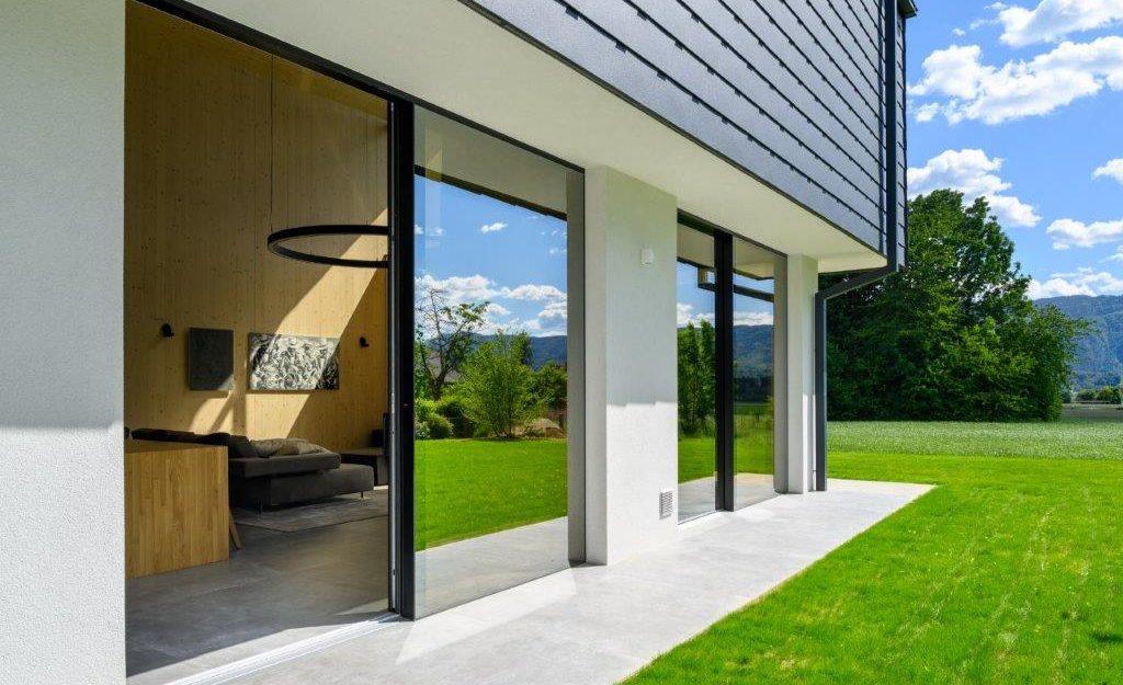 Finestra per architetture moderne con esterno in vetro: il legno è nascosto dietro il vetrocamera con bordo smaltato, donando alla facciata un aspetto minimale e pulito. All’interno rimane visibile il legno caldo e lavorato con precisione. Una soluzione che garantisce tenuta e stabilità anche nei grandi formati – un elemento architettonico discreto ma di forte identità.