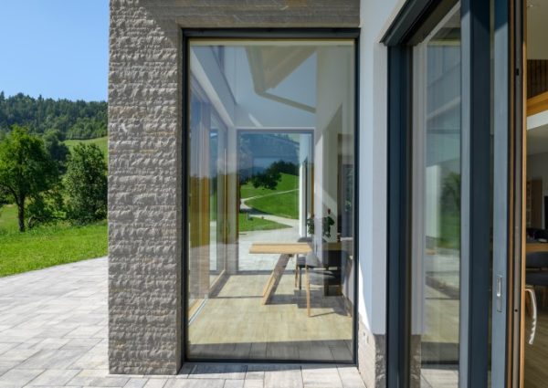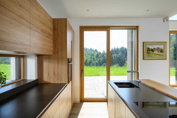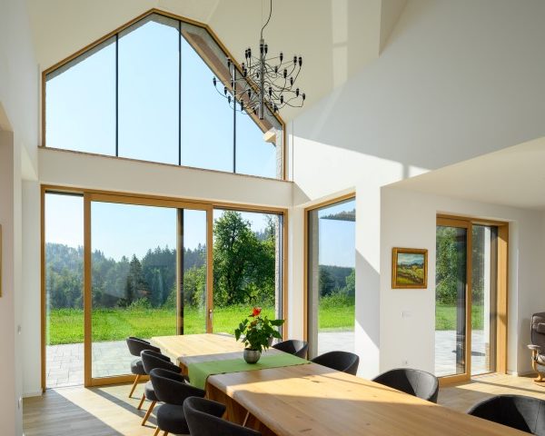 I proprietari hanno voluto, da un lato, avvicinare il più possibile l’architettura alle tradizioni costruttive della zona circostante e, dall’altro, aprirla alle viste uniche dei prati e dei boschi circostanti. Le meravigliose viste si aprono attraverso grandi pareti panoramiche in vetro e scorrevoli. Gli infissi in rovere sono visibili all’interno e incorniciano magnificamente le sfumature verdi della natura, mentre all’esterno sono protetti dalle intemperie dall’alluminio color antracite, abbinato al materiale scelto per la copertura. (Foto: Miran Kambič)