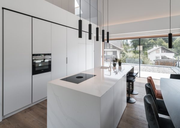 Finestra per architetture moderne con esterno in vetro: il legno è nascosto dietro il vetrocamera con bordo smaltato, donando alla facciata un aspetto minimale e pulito. All’interno rimane visibile il legno caldo e lavorato con precisione. Una soluzione che garantisce tenuta e stabilità anche nei grandi formati – un elemento architettonico discreto ma di forte identità.